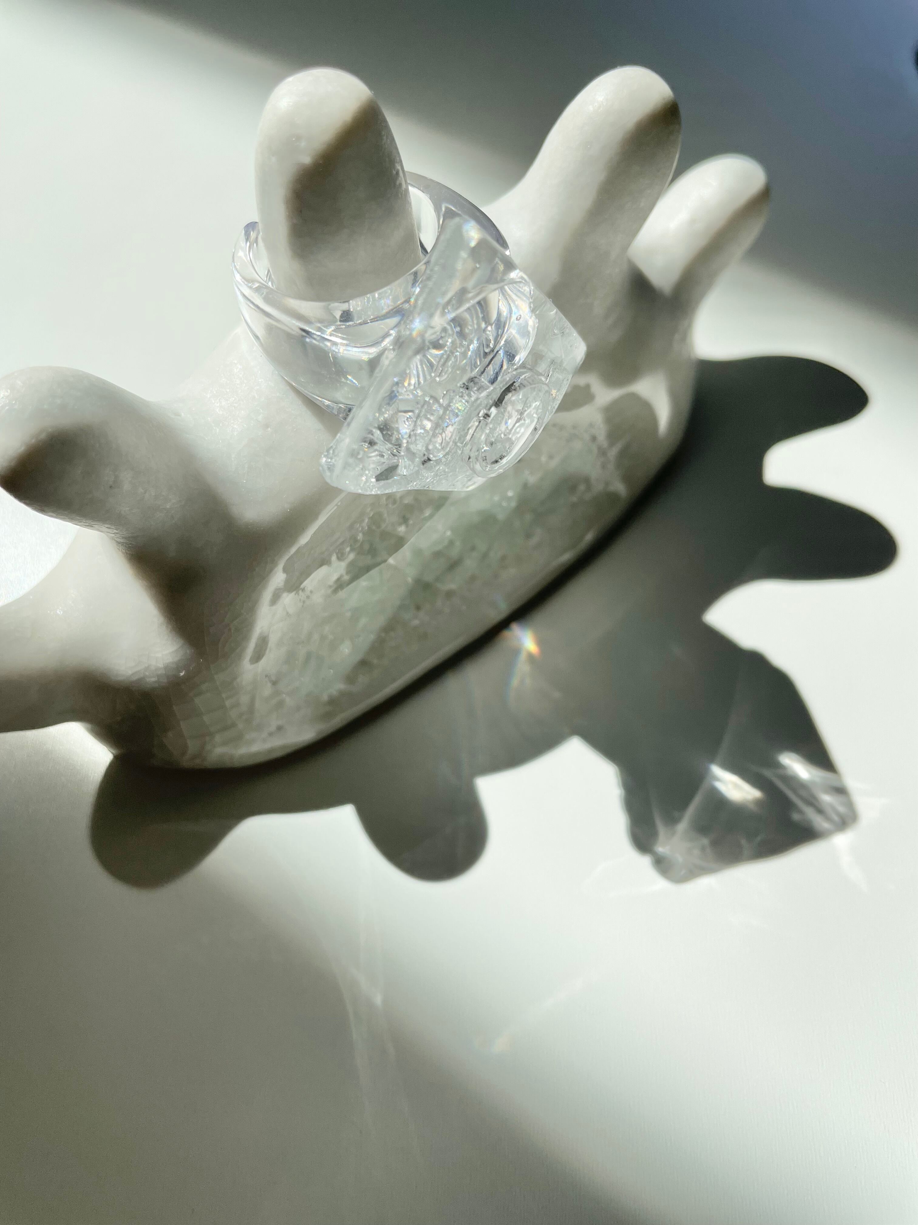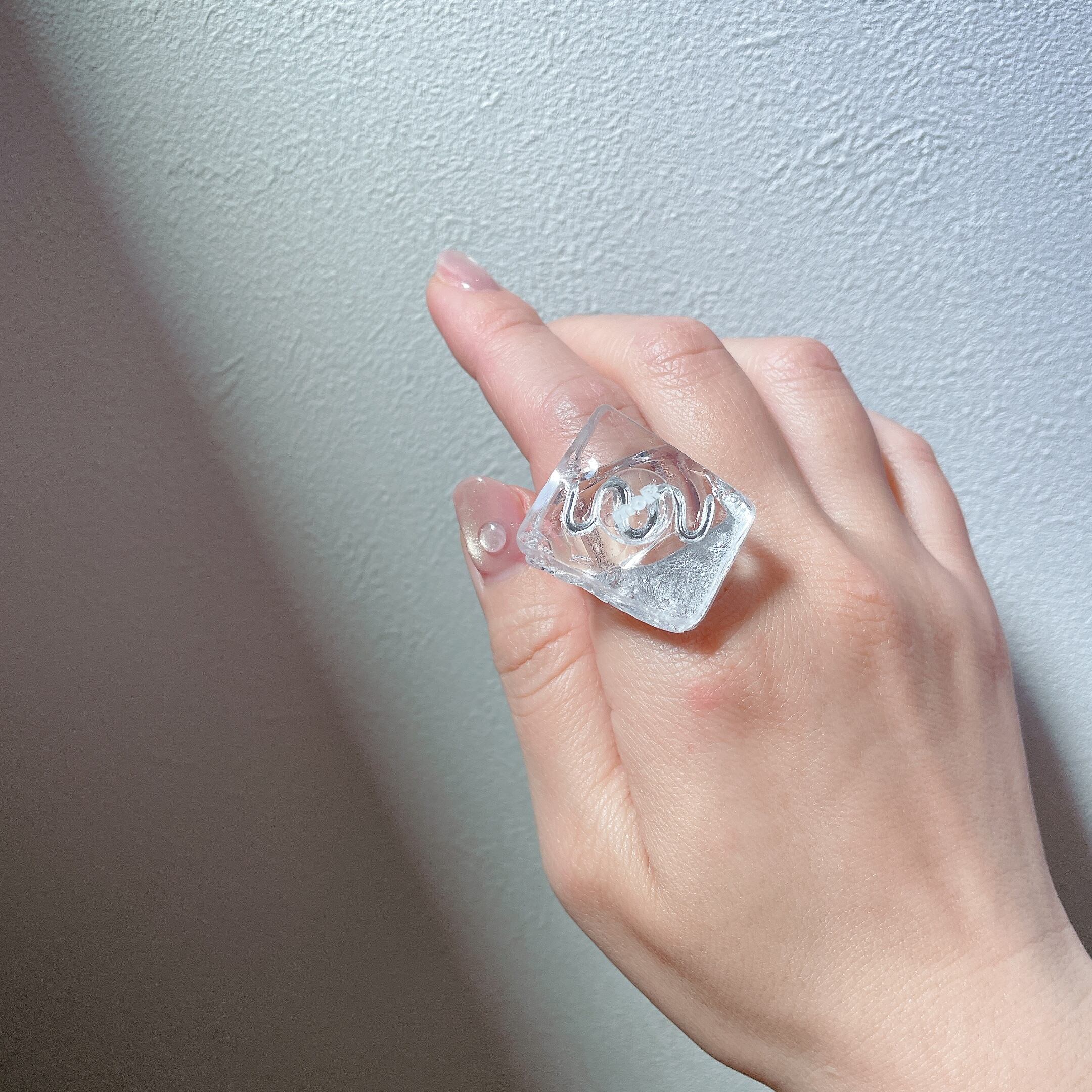 リング部分もクリアにすることで、全体の透明感がとてもキレイで、太めのリングなので安定感があります。そして、太めなボリュームリングが指をキレイにほっそりと見せてくれます。