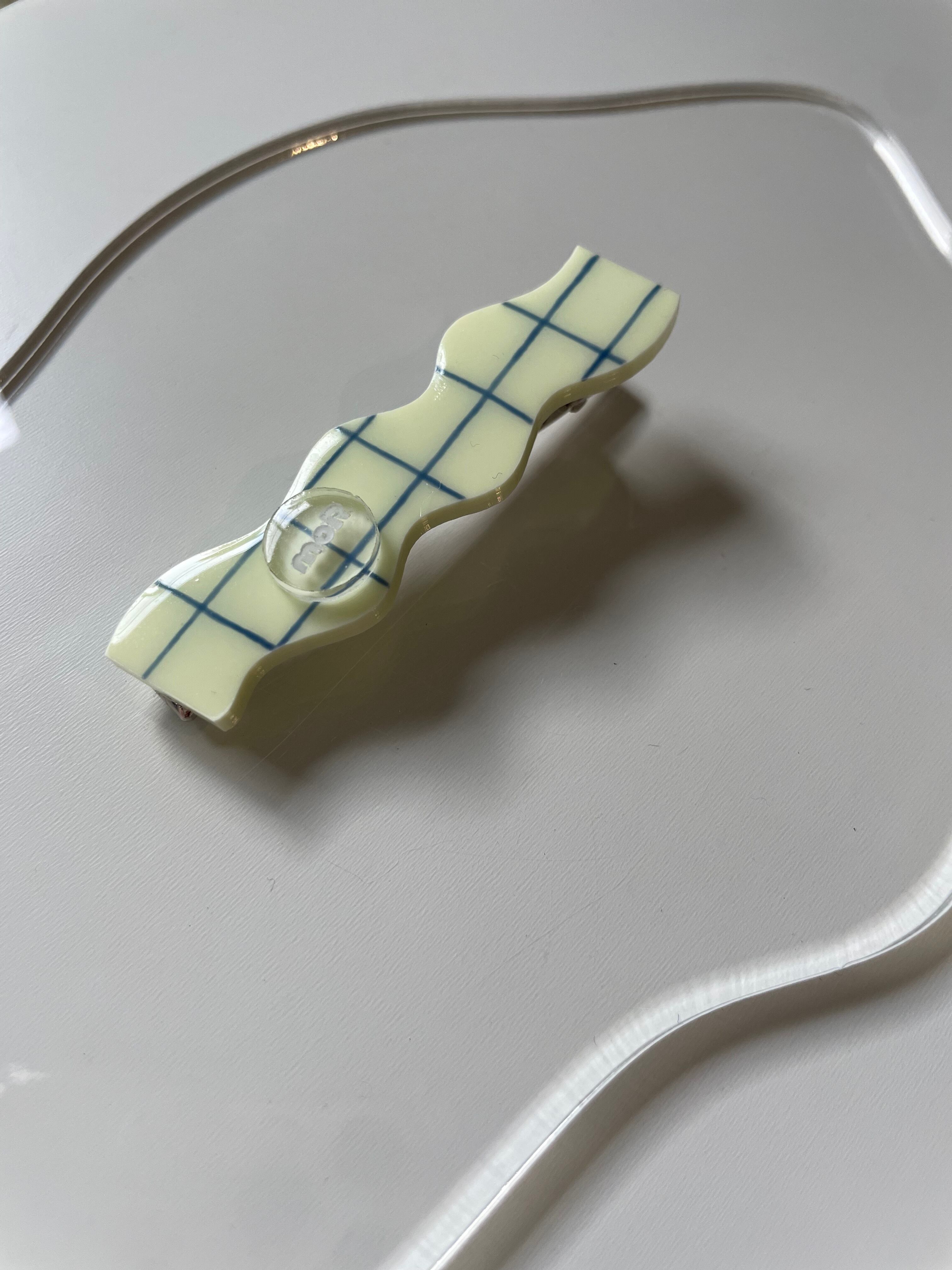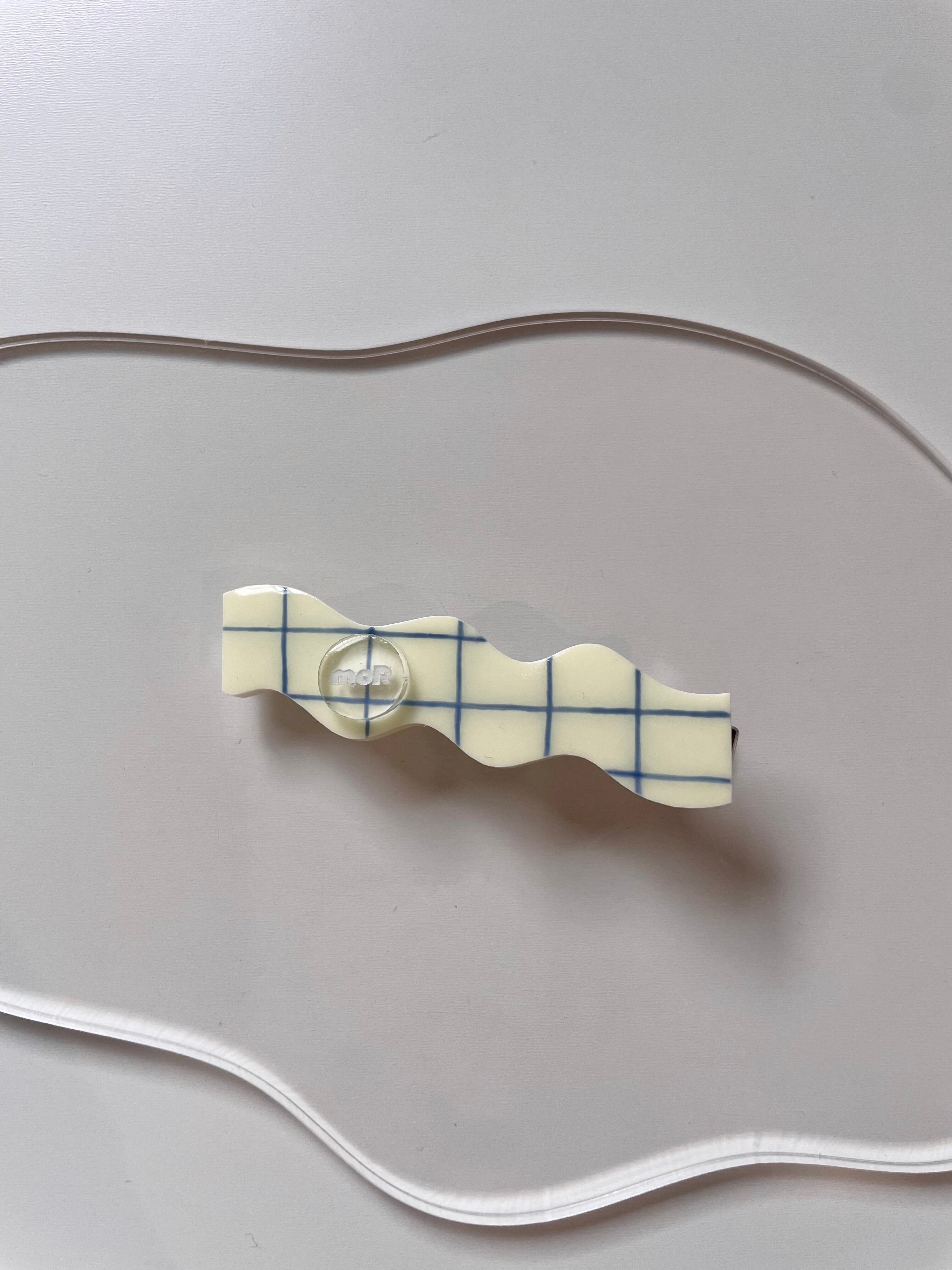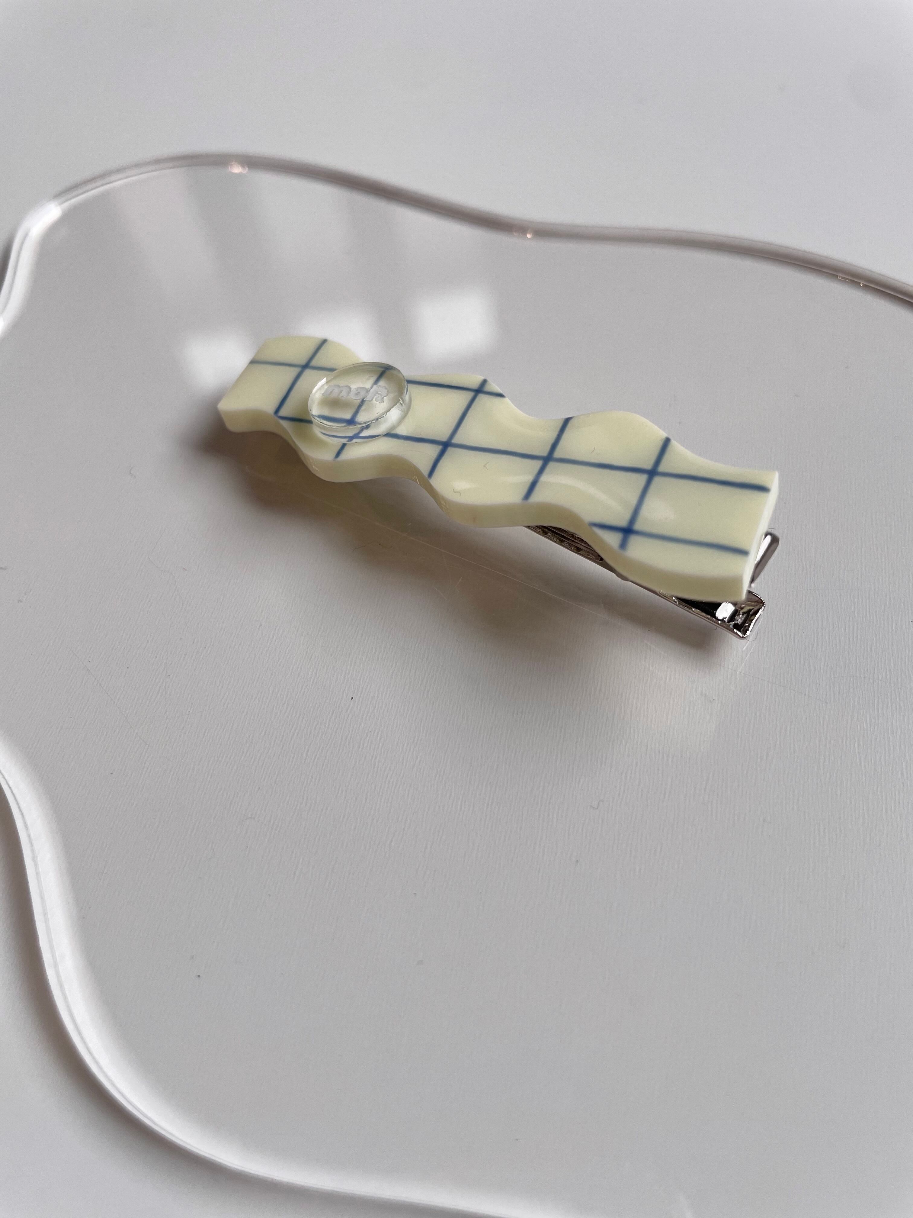 moRロゴのタイル柄を描いたhair clipです。なみなみの形がアクセントになって、シンプルな髪につけるだけで、とってもオシャレになります。